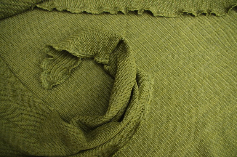 Es ist etwas griffiger als die Tücher Susi und Kyra von invero und vom Erscheinungsbild elegant, sportlich mit einem leichten Schimmer. Auch hier ist die Kante mit einer Ziernaht eingefasst und schließt mit einer aparten Kräuselung ab.